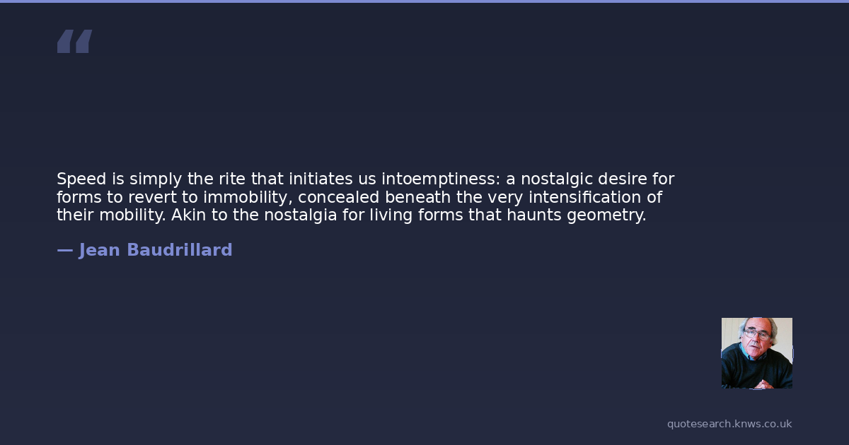 Speed is simply the rite that initiates us intoemptiness: a nostalgic desire for forms to revert to immobility, concealed beneath the very intensification of their mobility. Akin to the nostalgia for living forms that haunts geometry.