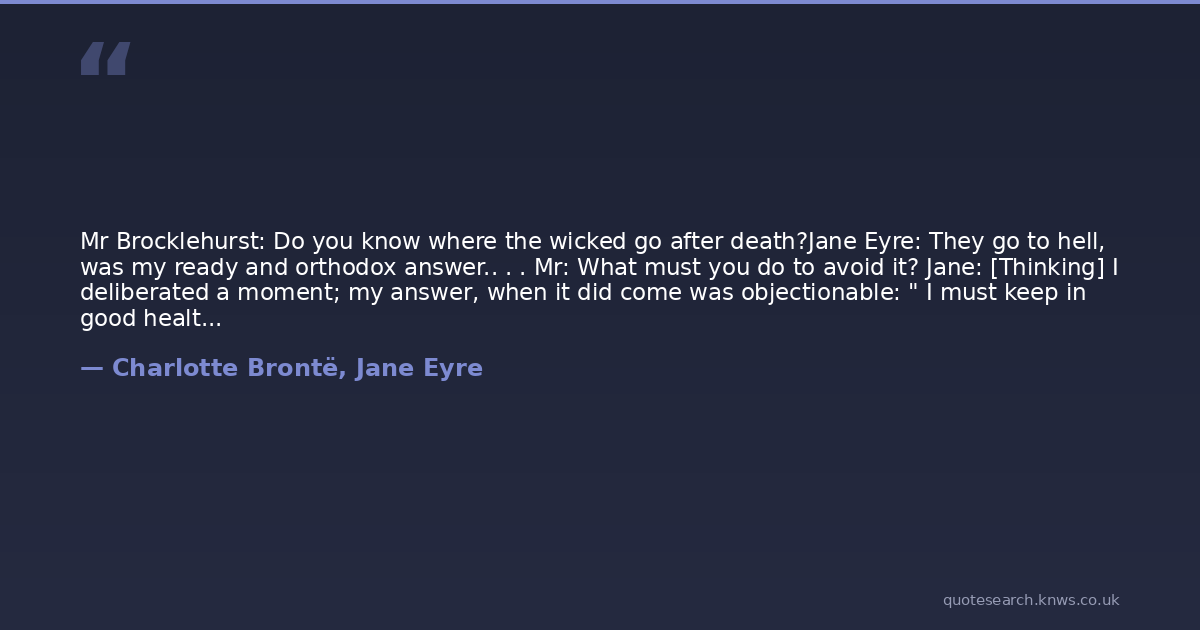 Mr Brocklehurst: Do you know where the wicked go after death?Jane Eyre: They go to hell, was my ready and orthodox answer.. . . Mr: What must you do to avoid it? Jane: [Thinking] I deliberated a moment; my answer, when it did come was objectionable: " I must keep in good health , and not die.
