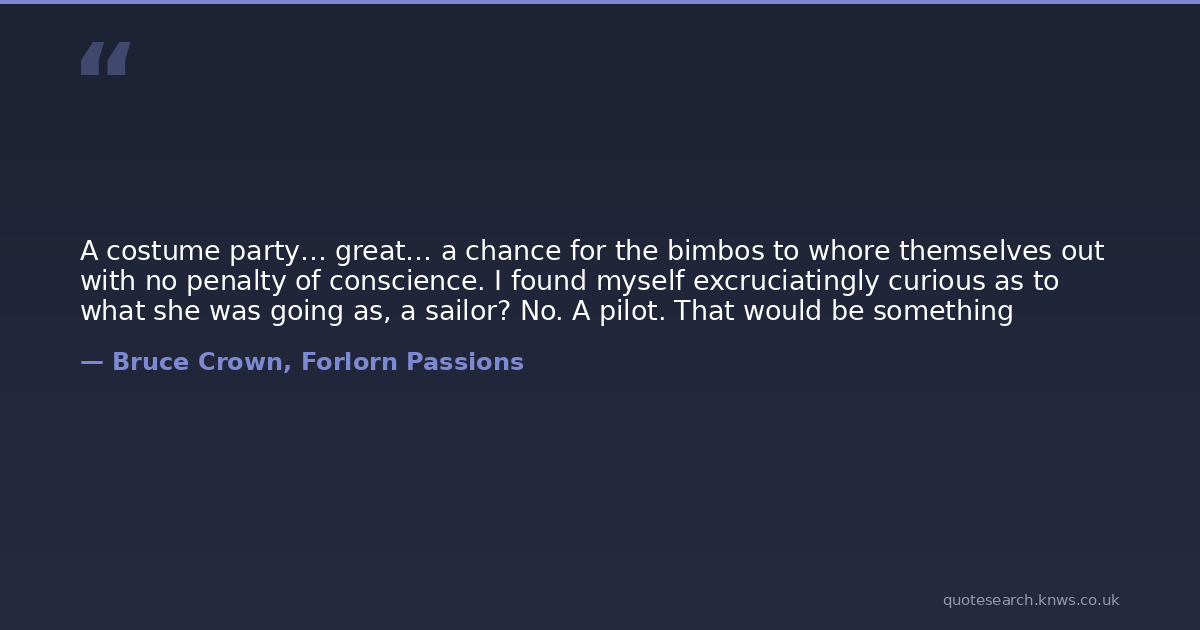 A costume party… great… a chance for the bimbos to whore themselves out with no penalty of conscience. I found myself excruciatingly curious as to what she was going as, a sailor? No. A pilot. That would be something