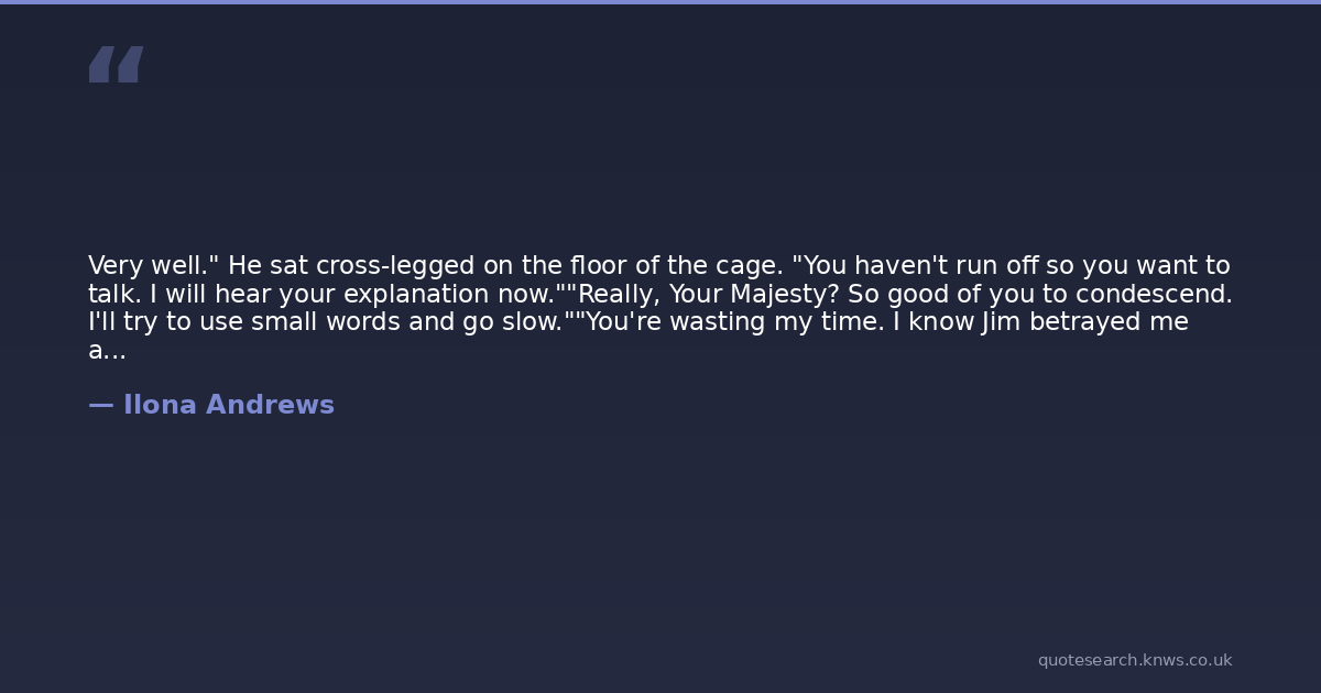Very well." He sat cross-legged on the floor of the cage. "You haven't run off so you want to talk. I will hear your explanation now.""Really, Your Majesty? So good of you to condescend. I'll try to use small words and go slow.""You're wasting my time. I know Jim betrayed me and you're covering for him. This is your chance to dazzle me wih your brillance or baffle me with your bullshit. You won't get another. When I get out, I won't be in the mood to listen.