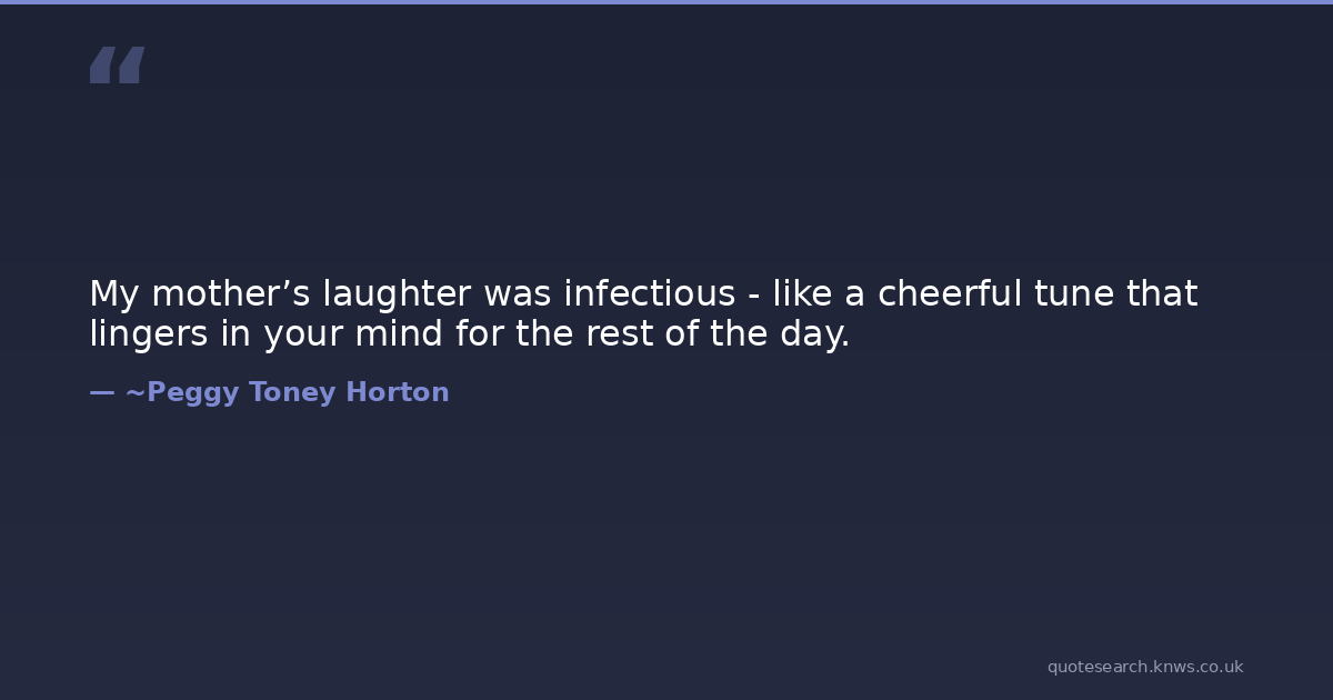 My mother’s laughter was infectious - like a cheerful tune that lingers in your mind for the rest of the day. cheerful-tune laughter lingers Download Image Share on X Share on Facebook Copy Link
