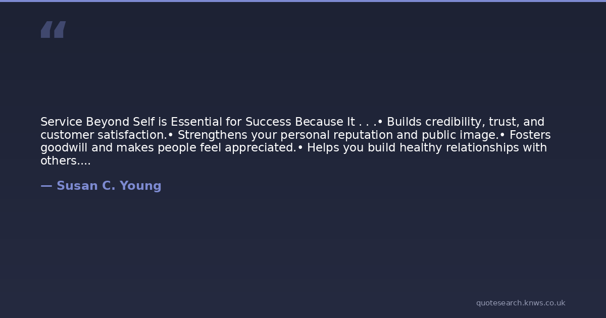 Service Beyond Self is Essential for Success Because It . . .• Builds credibility, trust, and customer satisfaction.• Strengthens your personal reputation and public image.• Fosters goodwill and makes people feel appreciated.• Helps you build healthy relationships with others.• Nurtures collaboration, participation, and cooperation.• Reaffirms a continuity of service for quality assurance, integrity, and reliability. • Saves money—it costs less to keep existing customers than it does to create new ones. When you do it right the first time, you don’t have to fix it the next time.• Improves communication and builds rapport.• Fosters mutual respect and understanding• By providing other people with what they want, you will get more of what you want!
