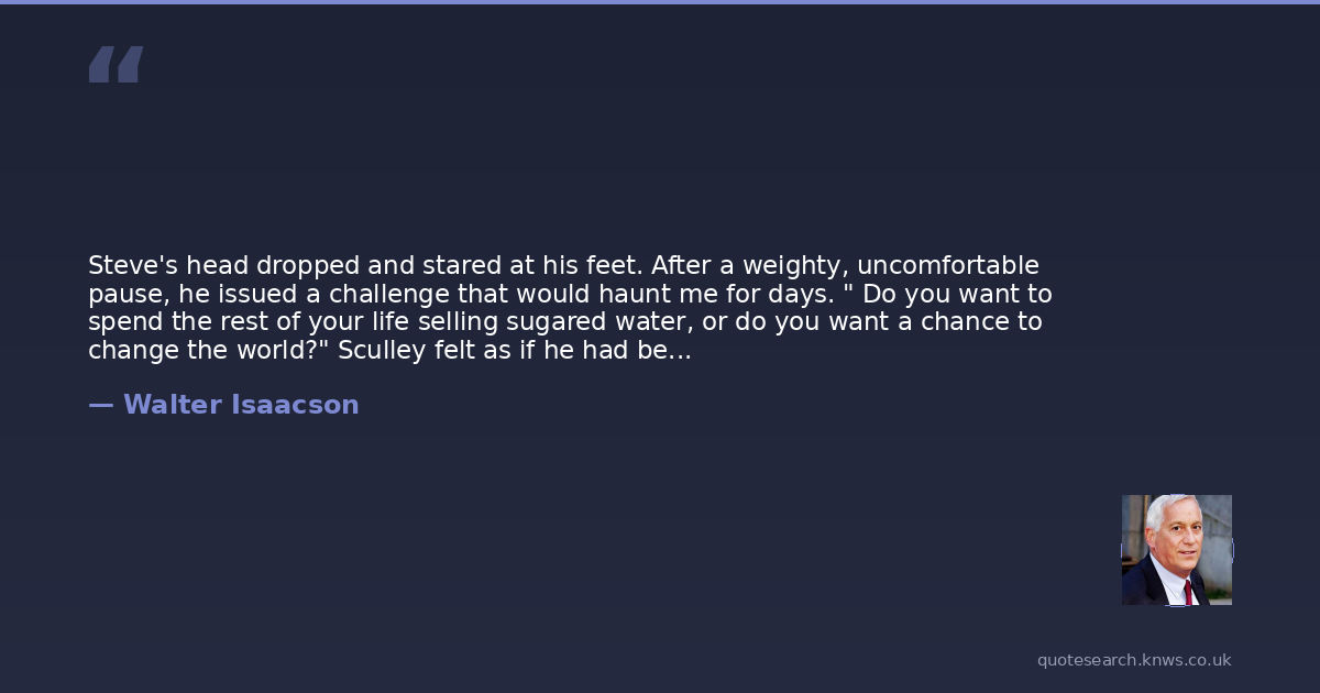 Steve's head dropped and stared at his feet. After a weighty, uncomfortable pause, he issued a challenge that would haunt me for days. " Do you want to spend the rest of your life selling sugared water, or do you want a chance to change the world?" Sculley felt as if he had been punched in the stomach. There was no response possible other than to acquiesce. " He had a uncanny ability to always get what he wanted, to size up a person and know exactly what to say to reach a person," Sculley recalled.