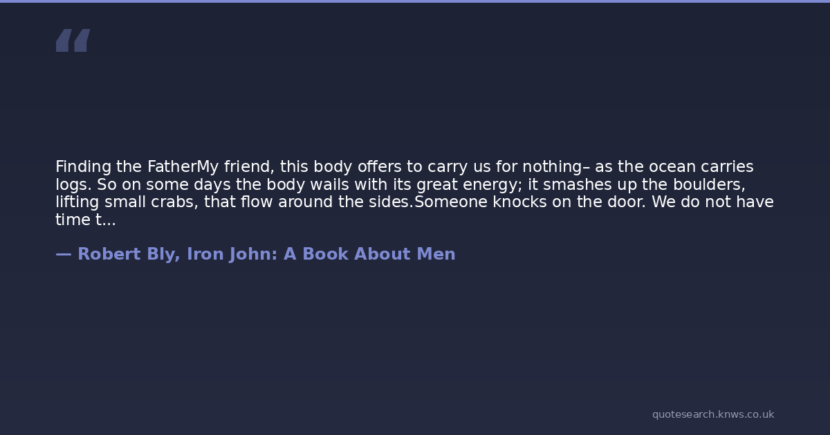 Finding the FatherMy friend, this body offers to carry us for nothing– as the ocean carries logs. So on some days the body wails with its great energy; it smashes up the boulders, lifting small crabs, that flow around the sides.Someone knocks on the door. We do not have time to dress. He wants us to go with him through the blowing and rainy streets, to the dark house.We will go there, the body says, and there find the father whom we have never met, who wandered out in a snowstorm the night we were born, and who then lost his memory, and has lived since longing for his child, whom he saw only once… while he worked as a shoemaker, as a cattle herder in Australia, as a restaurant cook who painted at night.When you light the lamp you will see him. He sits there behind the door… the eyebrows so heavy, the forehead so light… lonely in his whole body, waiting for you.