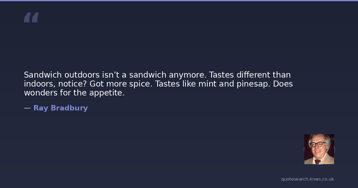 Sandwich outdoors isn’t a sandwich anymore. Tastes different than indoors, notice? Got more spice. Tastes like mint and pinesap. Does wonders for the appetite.