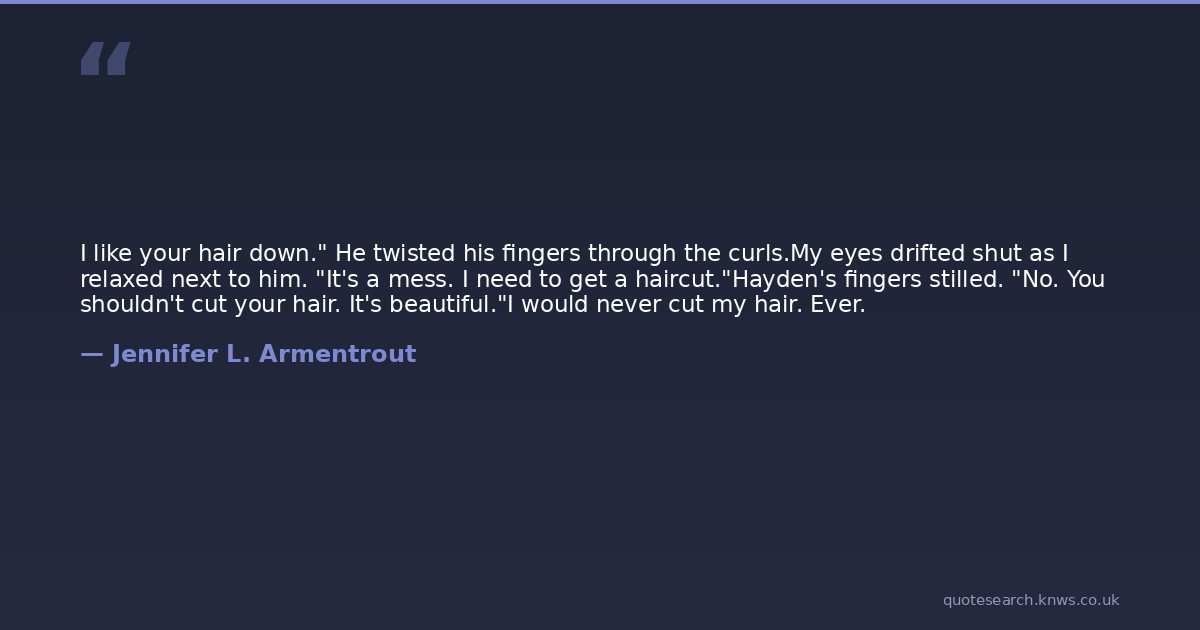 I like your hair down." He twisted his fingers through the curls.My eyes drifted shut as I relaxed next to him. "It's a mess. I need to get a haircut."Hayden's fingers stilled. "No. You shouldn't cut your hair. It's beautiful."I would never cut my hair. Ever.