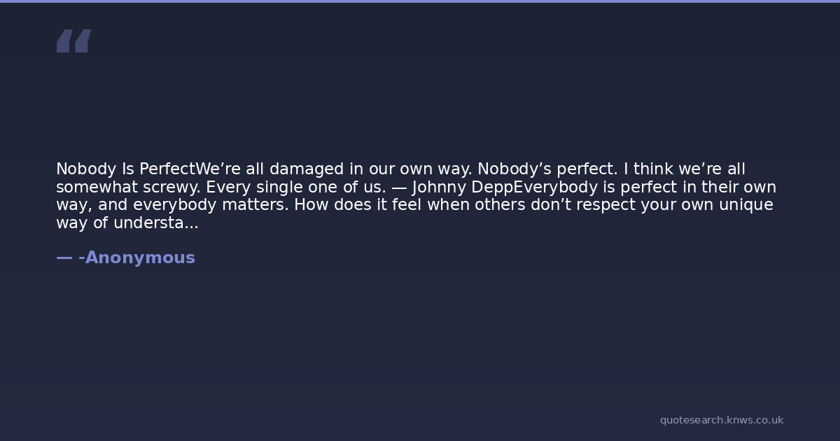 Nobody Is PerfectWe’re all damaged in our own way. Nobody’s perfect. I think we’re all somewhat screwy. Every single one of us. — Johnny DeppEverybody is perfect in their own way, and everybody matters. How does it feel when others don’t respect your own unique way of understanding? What happens when they try to change you according to their way? Everybody makes mistakes, and every mistake matters. How do you succeed when you don’t know what failure brings? Remember: feel comfortable and be happy in your own skin; have the courage to follow your own path confidently. Life is beautiful: there are no mistakes in life, only lessons to be learned.