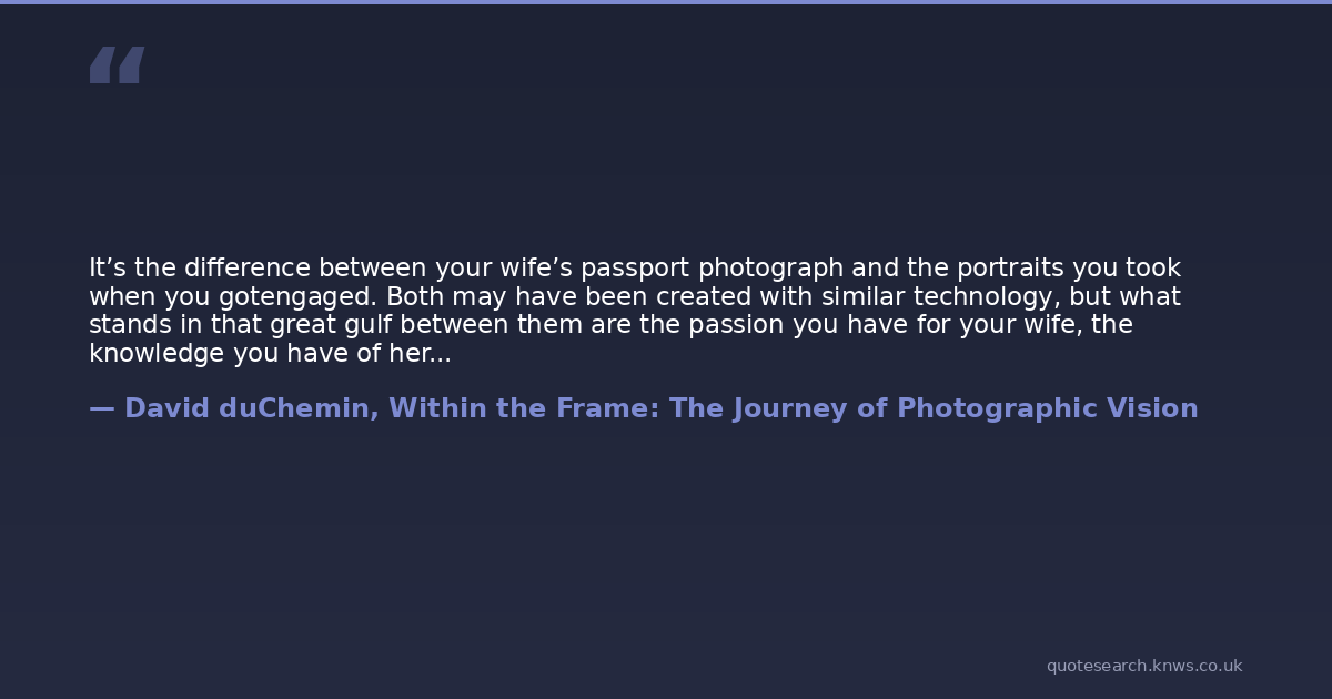 It’s the difference between your wife’s passport photograph and the portraits you took when you gotengaged. Both may have been created with similar technology, but what stands in that great gulf between them are the passion you have for your wife, the knowledge you have of her personality, and your willingness to use your craft, time, and energy to express that. One says, “She looks like this.” The other says, “This is who she is to me. It’s how I feel about her. See how amazing she is?