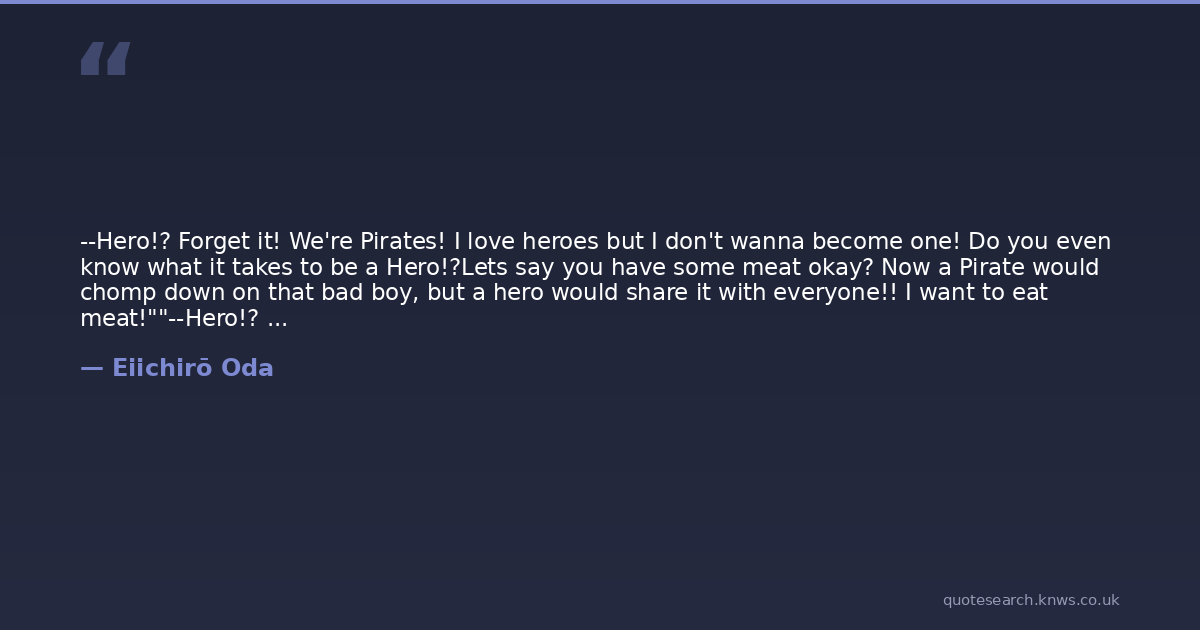 --Hero!? Forget it! We're Pirates! I love heroes but I don't wanna become one! Do you even know what it takes to be a Hero!?Lets say you have some meat okay? Now a Pirate would chomp down on that bad boy, but a hero would share it with everyone!! I want to eat meat!""--Hero!? Forget it! We're Pirates! I love heroes but I don't wanna become one! Do you even know what it takes to be a Hero!?Lets say you have some meat okay? Now a Pirate would chomp down on that bad boy, but a hero would share it with everyone!! I want to eat meat!" - Monkey D. Luffy