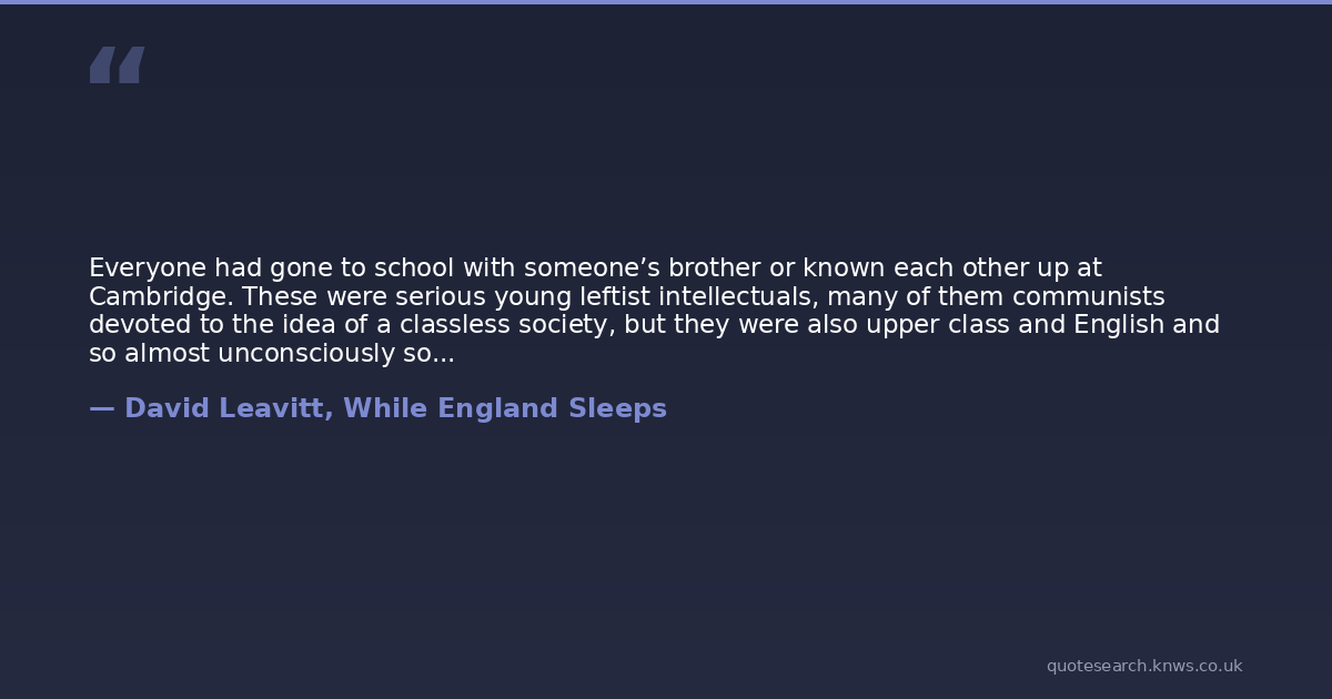 Everyone had gone to school with someone’s brother or known each other up at Cambridge. These were serious young leftist intellectuals, many of them communists devoted to the idea of a classless society, but they were also upper class and English and so almost unconsciously sought out others of their kind and mixed with them, while the working-class youth stood alone just outside the perimeter of this charmed circle, coming as close as he dared, barred from entry by an invisible boundary of accent.