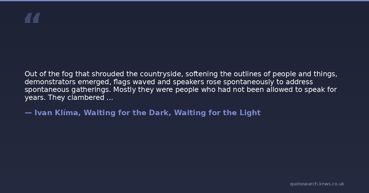 Out of the fog that shrouded the countryside, softening the outlines of people and things, demonstrators emerged, flags waved and speakers rose spontaneously to address spontaneous gatherings. Mostly they were people who had not been allowed to speak for years. They clambered on to piles of rock, balanced on the rims of fountains and on pedestals of statues whose removal they demanded, just as they demanded the removal of those who had bowed down before these statues. They spun visions of how everyone's life, including Pavel's own, would quickly be transformed and rise above the poverty in which it had for so long been mired. Others, who preferred actions to words, climbed onto rooftops to remove the snow-covered symbols of yesterday's power. They pulled down street signs and fastened in their place new plaques scrawled with names that until recently had been unmentionable, and they sometimes gathered threateningly under the windows of abandoned Party secretariats, ready to break in and begin, or rather complete, the purging. In every face he saw a kind of ecstasy that looked almost sexual.