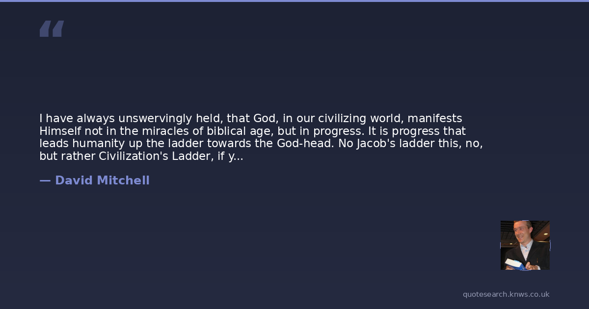 I have always unswervingly held, that God, in our civilizing world, manifests Himself not in the miracles of biblical age, but in progress. It is progress that leads humanity up the ladder towards the God-head. No Jacob's ladder this, no, but rather Civilization's Ladder, if you will.
