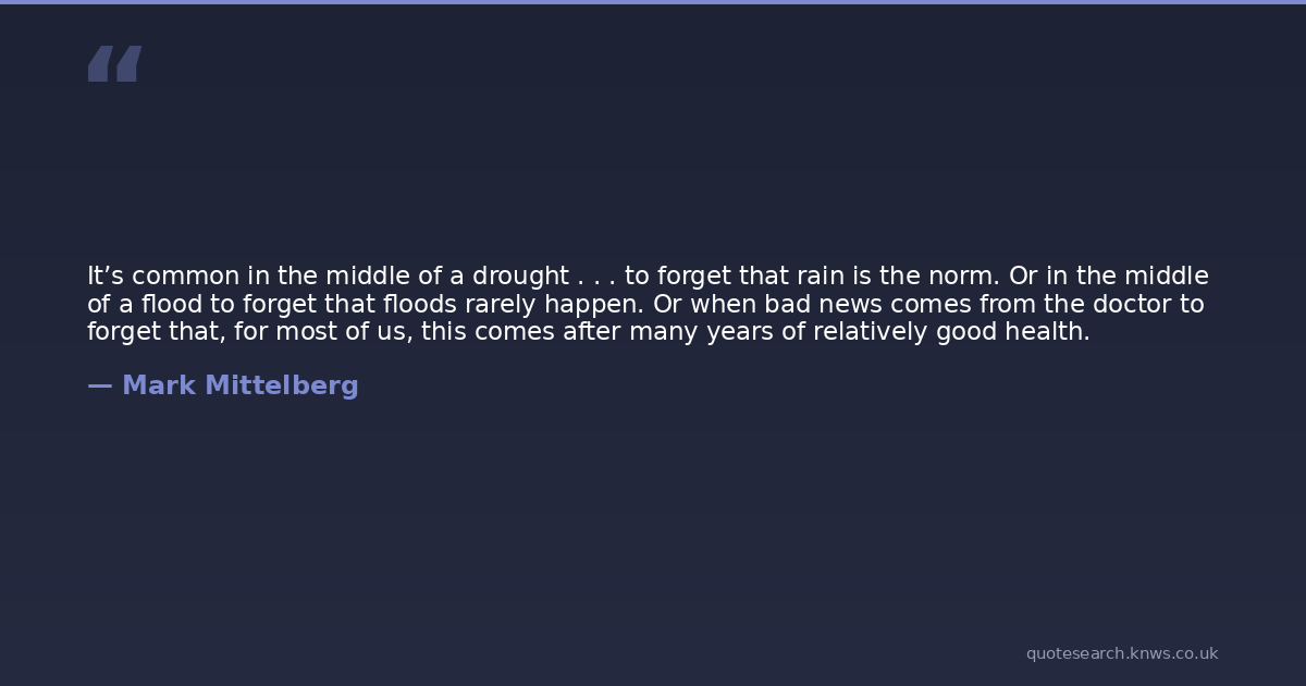 It’s common in the middle of a drought . . . to forget that rain is the norm. Or in the middle of a flood to forget that floods rarely happen. Or when bad news comes from the doctor to forget that, for most of us, this comes after many years of relatively good health.