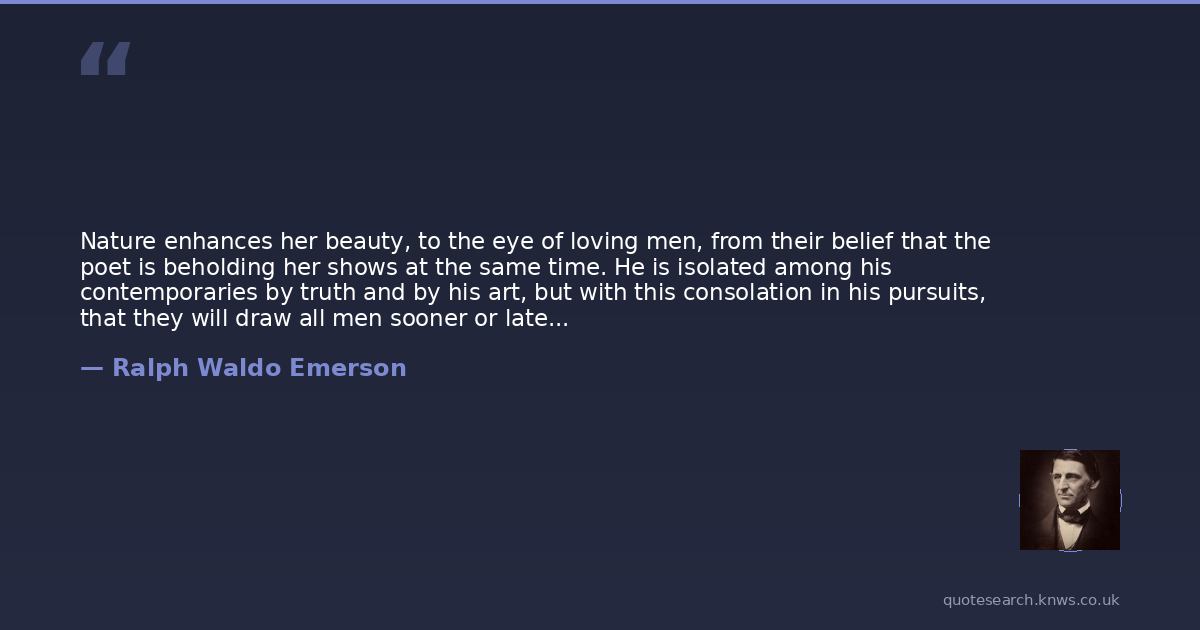 Nature enhances her beauty, to the eye of loving men, from their belief that the poet is beholding her shows at the same time. He is isolated among his contemporaries by truth and by his art, but with this consolation in his pursuits, that they will draw all men sooner or later. For all men live by truth and stand in need of expression. In love, in art, in avarice, in politics, in labor, in games, we study to utter our painful secret. The man is only half himself, the other half is his expression.