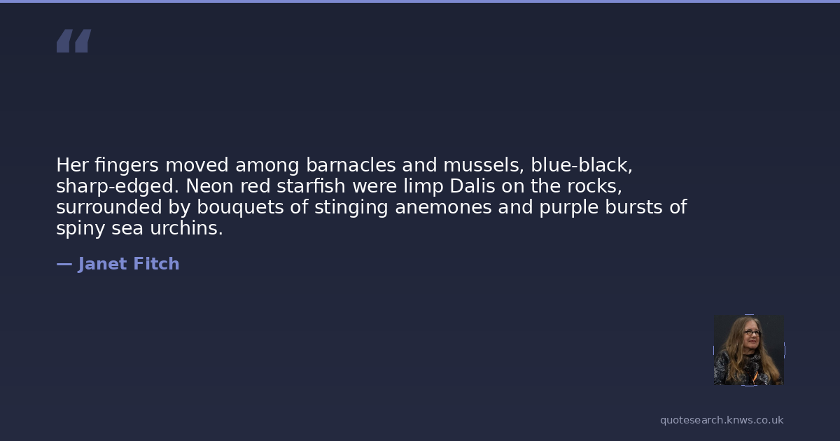 Her fingers moved among barnacles and mussels, blue-black, sharp-edged. Neon red starfish were limp Dalis on the rocks, surrounded by bouquets of stinging anemones and purple bursts of spiny sea urchins.