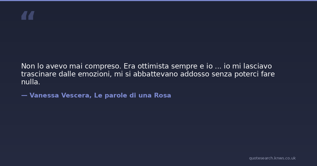 Non lo avevo mai compreso. Era ottimista sempre e io ... io mi lasciavo trascinare dalle emozioni, mi si abbattevano addosso senza poterci fare nulla.