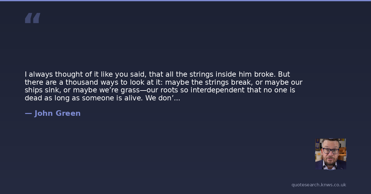 I always thought of it like you said, that all the strings inside him broke. But there are a thousand ways to look at it: maybe the strings break, or maybe our ships sink, or maybe we’re grass—our roots so interdependent that no one is dead as long as someone is alive. We don’t suffer from a shortage of metaphors, is what I mean. But you have to be careful which metaphor you choose, because it matters. If you choose the strings, then you’re imagining a world in which you can become irreparably broken. If you choose the grass, you’re saying that we are all infinitely interconnected, that we can use these root systems not only to understand one another but to become one another. The metaphors have implications. Do you know what I mean?