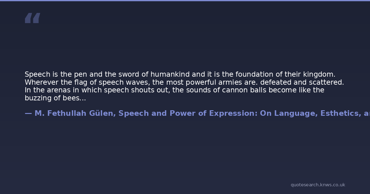 Speech is the pen and the sword of humankind and it is the foundation of their kingdom. Wherever the flag of speech waves, the most powerful armies are. defeated and scattered. In the arenas in which speech shouts out, the sounds of cannon balls become like the buzzing of bees. from behind the battlements on which the banner of speech has been raised, the sound of its drums are heard. In the precincts where its march reverberates, kings shake in their boots. The Master of Speech smashed to pieces many insurmountable walls, in the face of which Alexander the Great, Napoleon, and many others despaired or retread; and the pen of Speech, imparting and compliance, was saluted and praised.