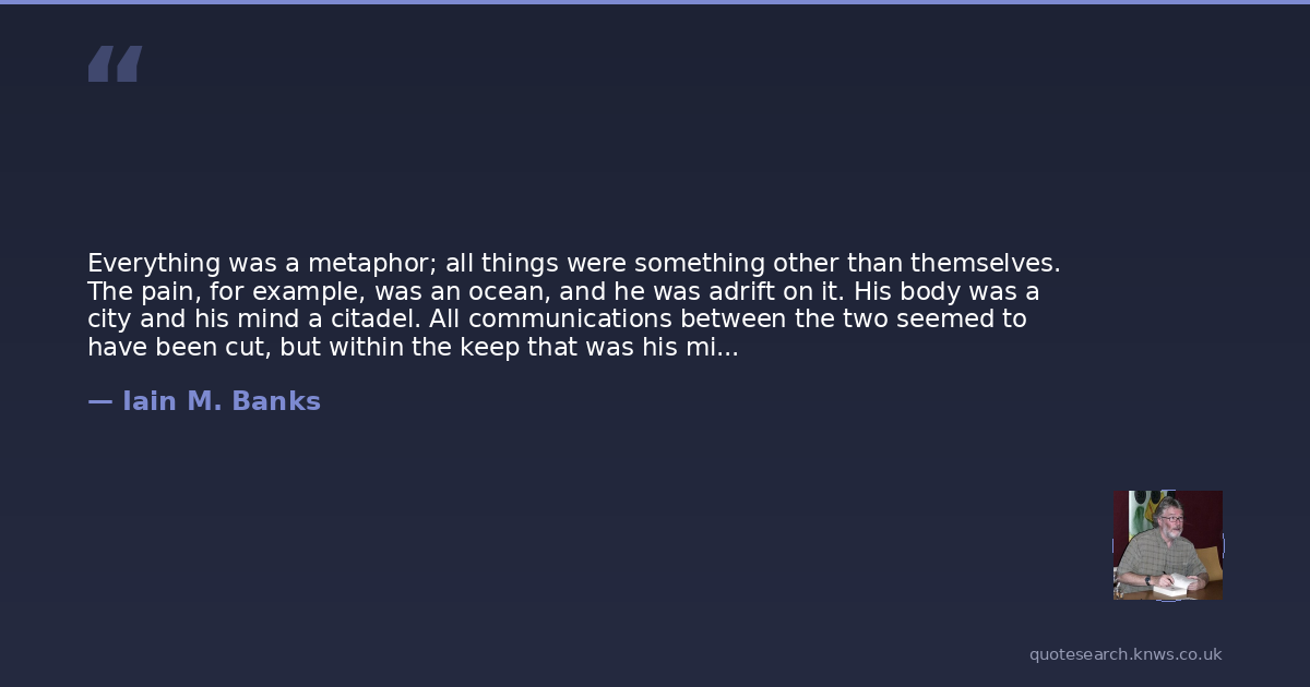 Everything was a metaphor; all things were something other than themselves. The pain, for example, was an ocean, and he was adrift on it. His body was a city and his mind a citadel. All communications between the two seemed to have been cut, but within the keep that was his mind he still had power. The part of his consciousness that was telling him the pain did not hurt, and that all things were like other things, was like...like...he found it hard to think of a comparison. A magic mirror, maybe.