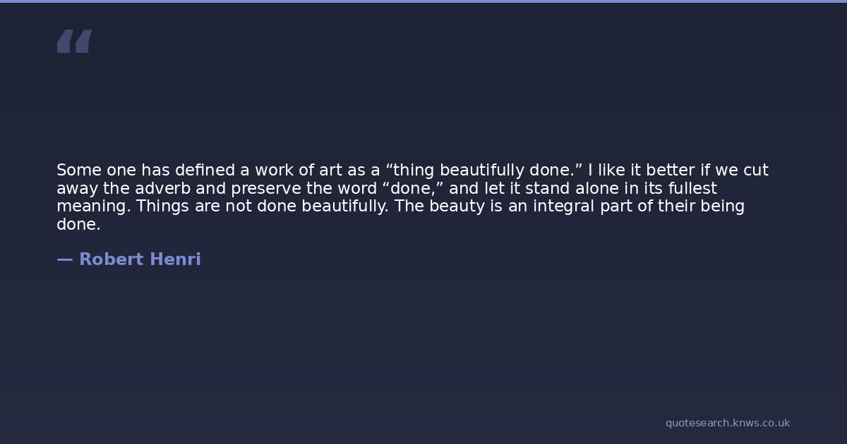 Some one has defined a work of art as a “thing beautifully done.” I like it better if we cut away the adverb and preserve the word “done,” and let it stand alone in its fullest meaning. Things are not done beautifully. The beauty is an integral part of their being done.