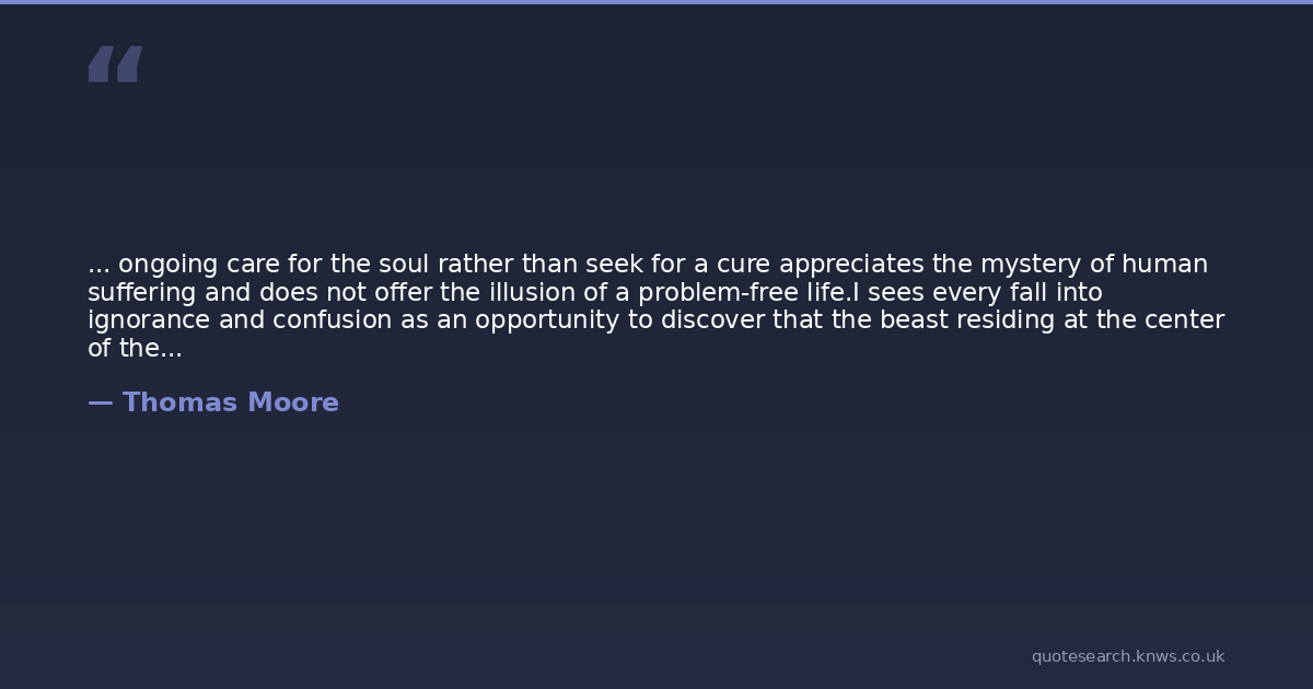 ... ongoing care for the soul rather than seek for a cure appreciates the mystery of human suffering and does not offer the illusion of a problem-free life.I sees every fall into ignorance and confusion as an opportunity to discover that the beast residing at the center of the labyrinth is also an angel.To approach this paradoxial point of tension where adjustment and abnormality meet is to move closer to the realization of our mystery-filled, star-born nature.It is a beast this thing that stirs in the core of our being, but it is also the star of our innermost nature.We have to care for this suffering with extreme reverence so that in our fear and anger at the beast, we do not overlock the star.~Thomas Moore *Care of the Soul*