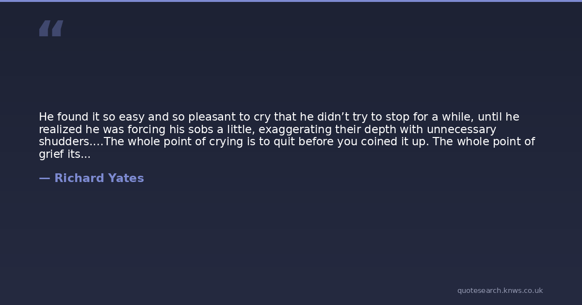 He found it so easy and so pleasant to cry that he didn’t try to stop for a while, until he realized he was forcing his sobs a little, exaggerating their depth with unnecessary shudders.…The whole point of crying is to quit before you coined it up. The whole point of grief itself was to cut it out while it was still honest, while it still meant something. Because the thing was so easily corrupted