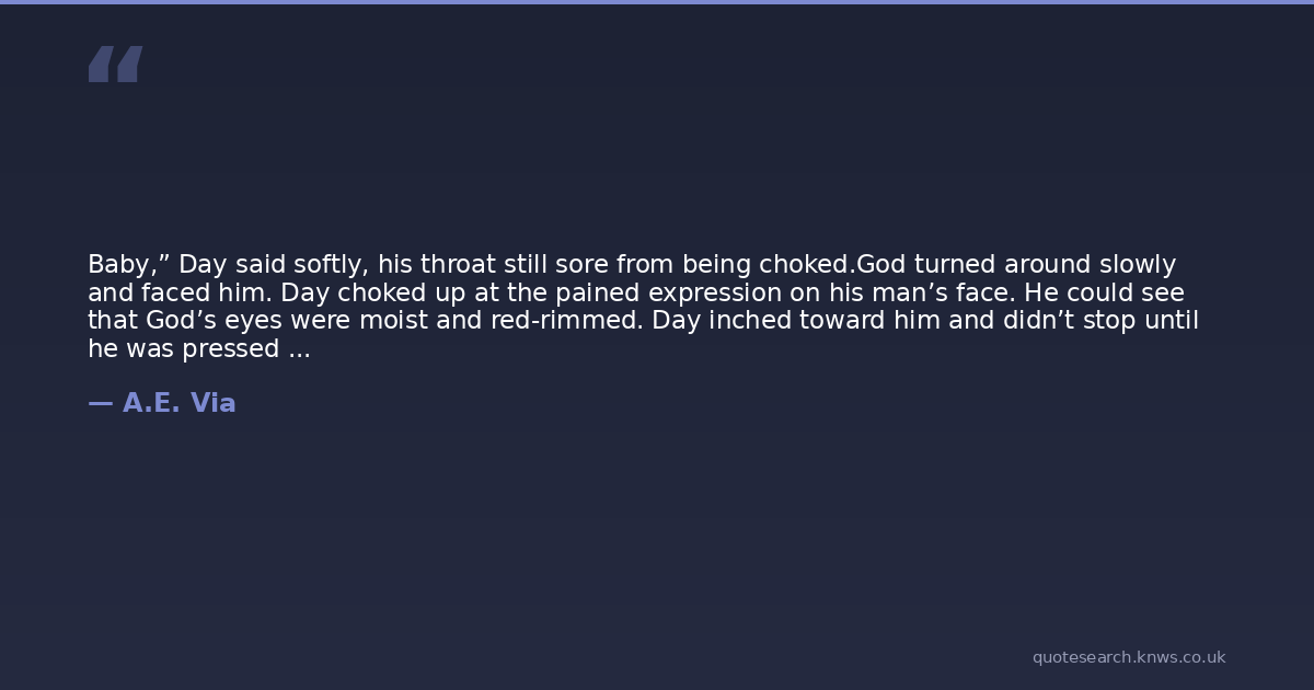 Baby,” Day said softly, his throat still sore from being choked.God turned around slowly and faced him. Day choked up at the pained expression on his man’s face. He could see that God’s eyes were moist and red-rimmed. Day inched toward him and didn’t stop until he was pressed against that broad chest. God’s strong arms came around him and squeezed him hard. The guttural moan the man released against his temple made Day’s heart seize.God pulled back and gripped a handful of Day’s hair pulling so that he was looking up at him. God bent down and oh so gently grazed his soft lips across his. Day’s body vibrated from the sensual feeling. God rubbed his face all over Day’s as if he was marking him with his scent. God’s grip tightened in his hair and he moaned again. Day could feel God’s body trembling and Day didn’t know at that moment if the shaking was from residual fear or need, so he didn’t move as he let his lover do what he needed to do.God released the punishing grip and his large palms shook as they ghosted over Day’s face. His chin was tilted up by firm fingers and again was blessed with feathery-soft kisses. God leaned back in and draped his arms completely around him and Day embraced him back. The soft piano from the album serenaded them and God just barely rocked their bodies back and forth in a very slow dance. Every few seconds he’d stop to place kisses on his forehead before leaning back in.