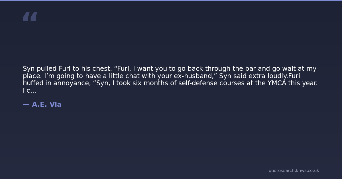 Syn pulled Furi to his chest. “Furi, I want you to go back through the bar and go wait at my place. I’m going to have a little chat with your ex-husband,” Syn said extra loudly.Furi huffed in annoyance, “Syn, I took six months of self-defense courses at the YMCA this year. I can fight for myself.”Syn looked at Furi like he’d lost his damn mind. “At the Y? Well hell, that’s great Furious. If you ever get jumped by the Village People, feel free to pull out those moves. As for now, I want you to take your karate-kicking-YMCA-going-ass back to my apartment,” Syn snarled at Furi, urging him toward the door, having neither the time nor the patience to argue with his ridiculous pride. Thankfully, with one final glare Furi went back into the pub. When Syn turned back, God and Day were looking back and forth between him and his two foes.“What’s going on here, fellas?” God asked casually, not acknowledging Syn.