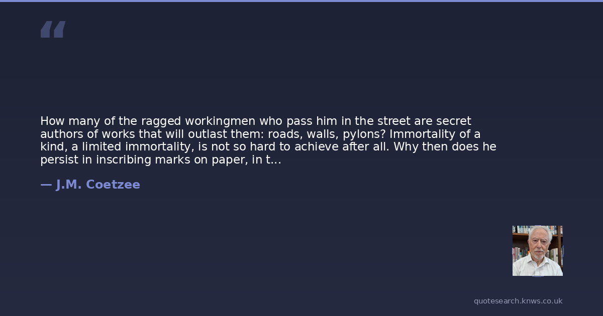 How many of the ragged workingmen who pass him in the street are secret authors of works that will outlast them: roads, walls, pylons? Immortality of a kind, a limited immortality, is not so hard to achieve after all. Why then does he persist in inscribing marks on paper, in the faint hope that people not yet born will take the trouble to decipher them?