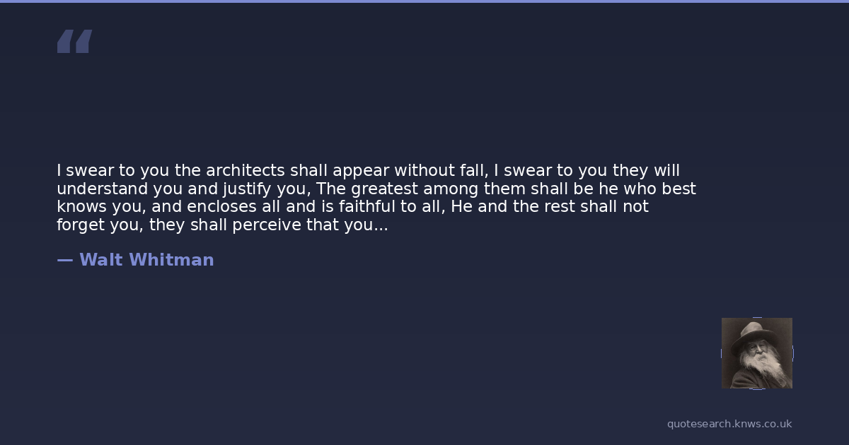 I swear to you the architects shall appear without fall, I swear to you they will understand you and justify you, The greatest among them shall be he who best knows you, and encloses all and is faithful to all, He and the rest shall not forget you, they shall perceive that you are not an iota less than they, You shall be fully glorified in them.