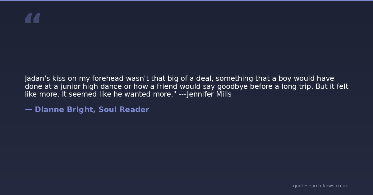 Jadan's kiss on my forehead wasn't that big of a deal, something that a boy would have done at a junior high dance or how a friend would say goodbye before a long trip. But it felt like more. It seemed like he wanted more." ---Jennifer Mills
