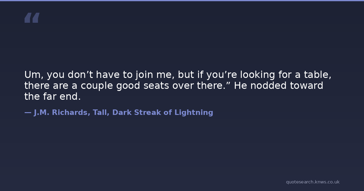 Um, you don’t have to join me, but if you’re looking for a table, there are a couple good seats over there.” He nodded toward the far end.