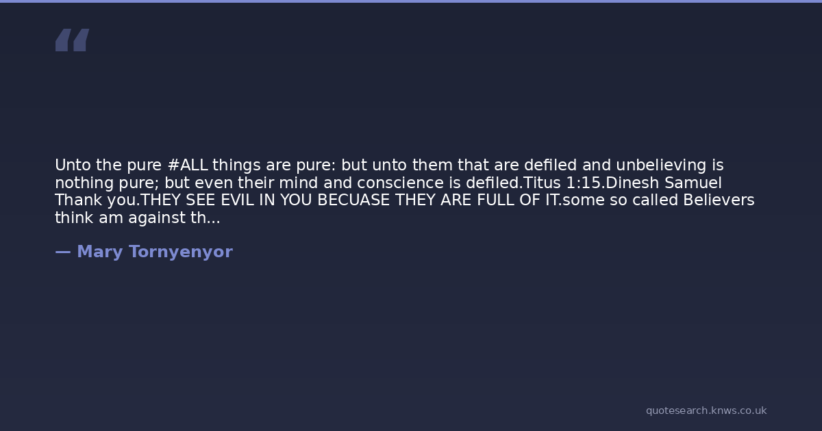 Unto the pure #ALL things are pure: but unto them that are defiled and unbelieving is nothing pure; but even their mind and conscience is defiled.Titus 1:15.Dinesh Samuel Thank you.THEY SEE EVIL IN YOU BECUASE THEY ARE FULL OF IT.some so called Believers think am against the message. some so called Unbelievers think am going crazy and defends the message. They are all right, because I BELONG TO JESUS ALONE. In Christ Alone.1 Corinthians 13:7 kjv6 Rejoiceth not in iniquity, but rejoiceth in the truth; 7Beareth all things, believeth all things, hopeth all things, endureth all things. 8Charity never faileth: but whether there be prophecies, they shall fail; whether there be tongues, they shall cease; whether there be knowledge, it shall vanish away. 9For we know in part, and we prophesy in part. 10But when that which is perfect is come, then that which is in part shall be done away.