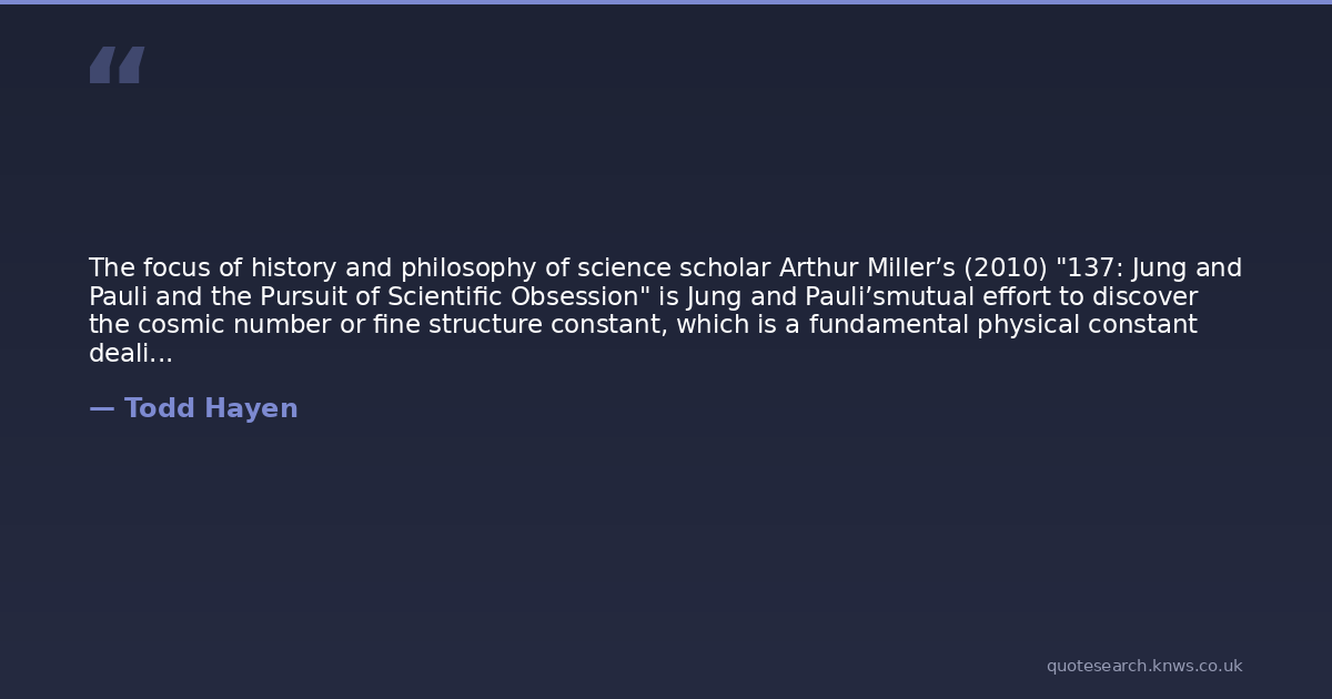 The focus of history and philosophy of science scholar Arthur Miller’s (2010) "137: Jung and Pauli and the Pursuit of Scientific Obsession" is Jung and Pauli’smutual effort to discover the cosmic number or fine structure constant, which is a fundamental physical constant dealing with electromagnetism, or, from a different perspective, could be considered the philosopher’s stone of the mathematical universe.This was indeed one of Pauli and Jung’s collaborative passions, but it was not the only concentration of their relationship. Quantum physics could be seen as the natural progression from ancient alchemy, through chemistry, culminating in the abstract world of subatomic particles, wave functions, and mathematics. [Ancient Egypt and Modern Psychotherapy]