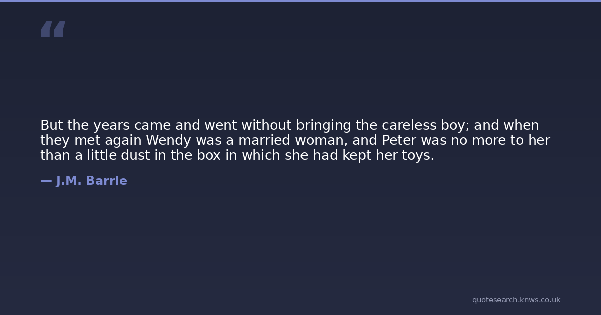 But the years came and went without bringing the careless boy; and when they met again Wendy was a married woman, and Peter was no more to her than a little dust in the box in which she had kept her toys.
