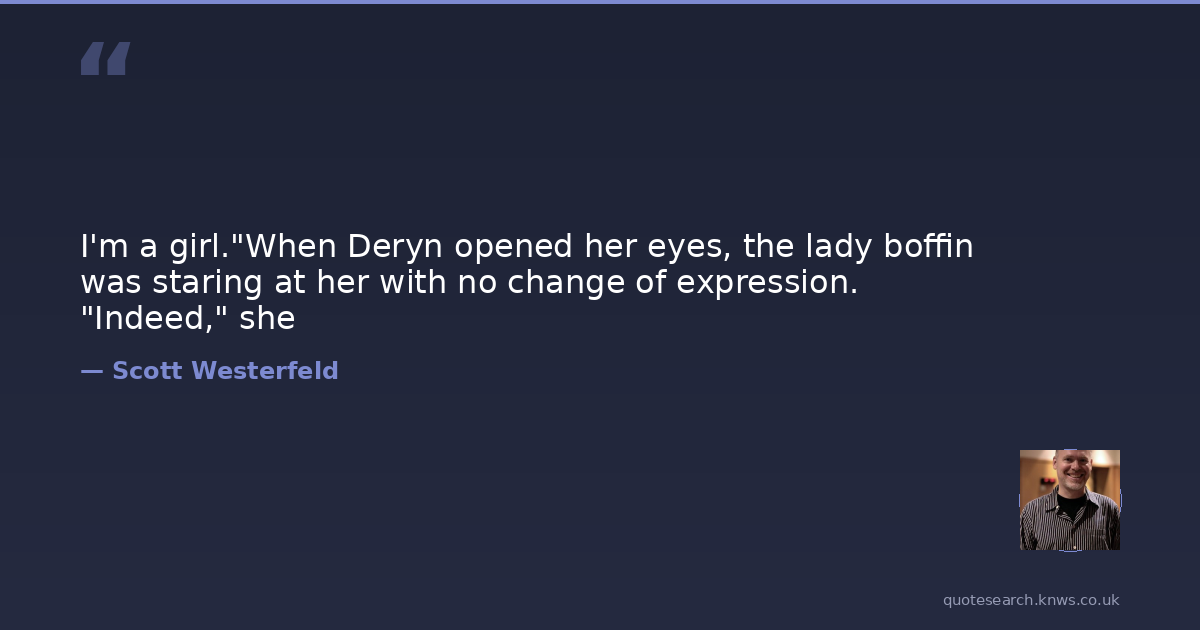 I'm a girl."When Deryn opened her eyes, the lady boffin was staring at her with no change of expression. "Indeed," she