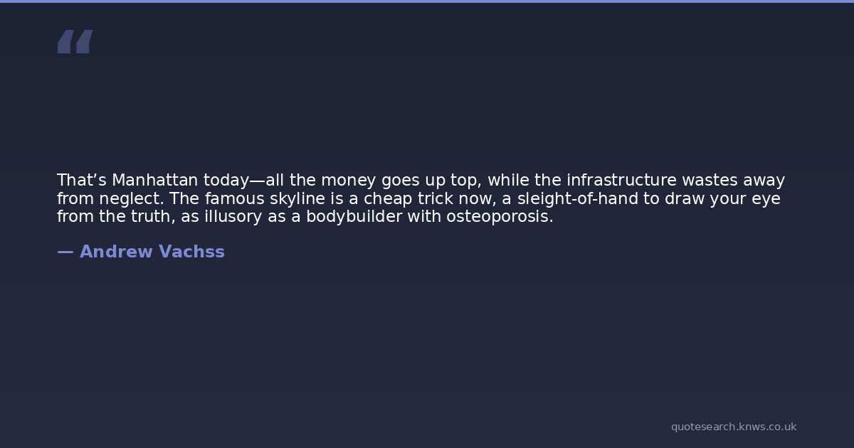 That’s Manhattan today—all the money goes up top, while the infrastructure wastes away from neglect. The famous skyline is a cheap trick now, a sleight-of-hand to draw your eye from the truth, as illusory as a bodybuilder with osteoporosis.