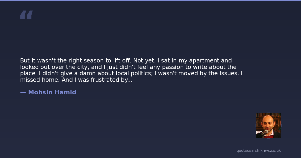 But it wasn't the right season to lift off. Not yet. I sat in my apartment and looked out over the city, and I just didn't feel any passion to write about the place. I didn't give a damn about local politics; I wasn't moved by the issues. I missed home. And I was frustrated by people who actually thought the world was a centre and that centre was here. ‘The world's a sphere, everyone,’ I wanted to say. ‘The centre of a sphere doesn't lie on its surface. Look up the word 'superficial', when you have a chance.