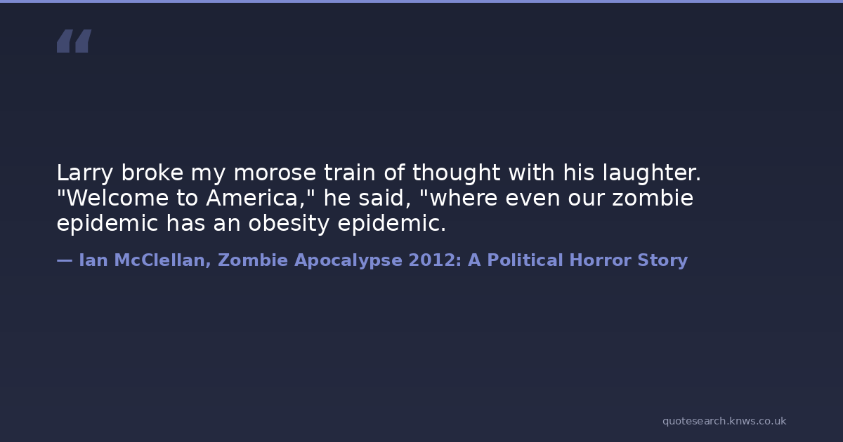 Larry broke my morose train of thought with his laughter. "Welcome to America," he said, "where even our zombie epidemic has an obesity epidemic.
