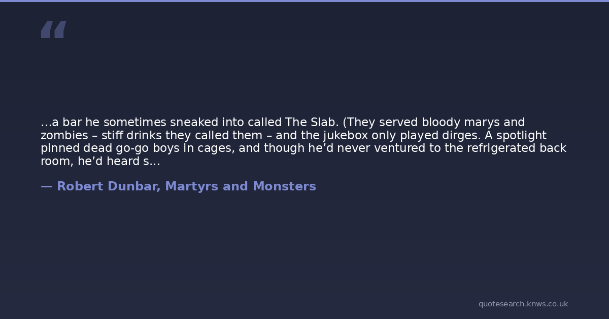 …a bar he sometimes sneaked into called The Slab. (They served bloody marys and zombies – stiff drinks they called them – and the jukebox only played dirges. A spotlight pinned dead go-go boys in cages, and though he’d never ventured to the refrigerated back room, he’d heard stories.)