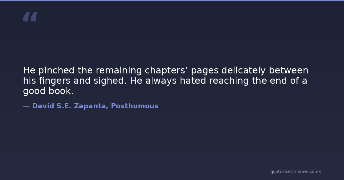 He pinched the remaining chapters’ pages delicately between his fingers and sighed. He always hated reaching the end of a good book.