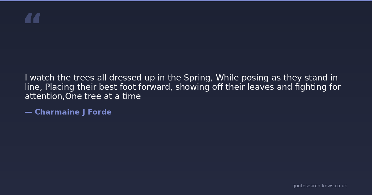 I watch the trees all dressed up in the Spring, While posing as they stand in line, Placing their best foot forward, showing off their leaves and fighting for attention,One tree at a time