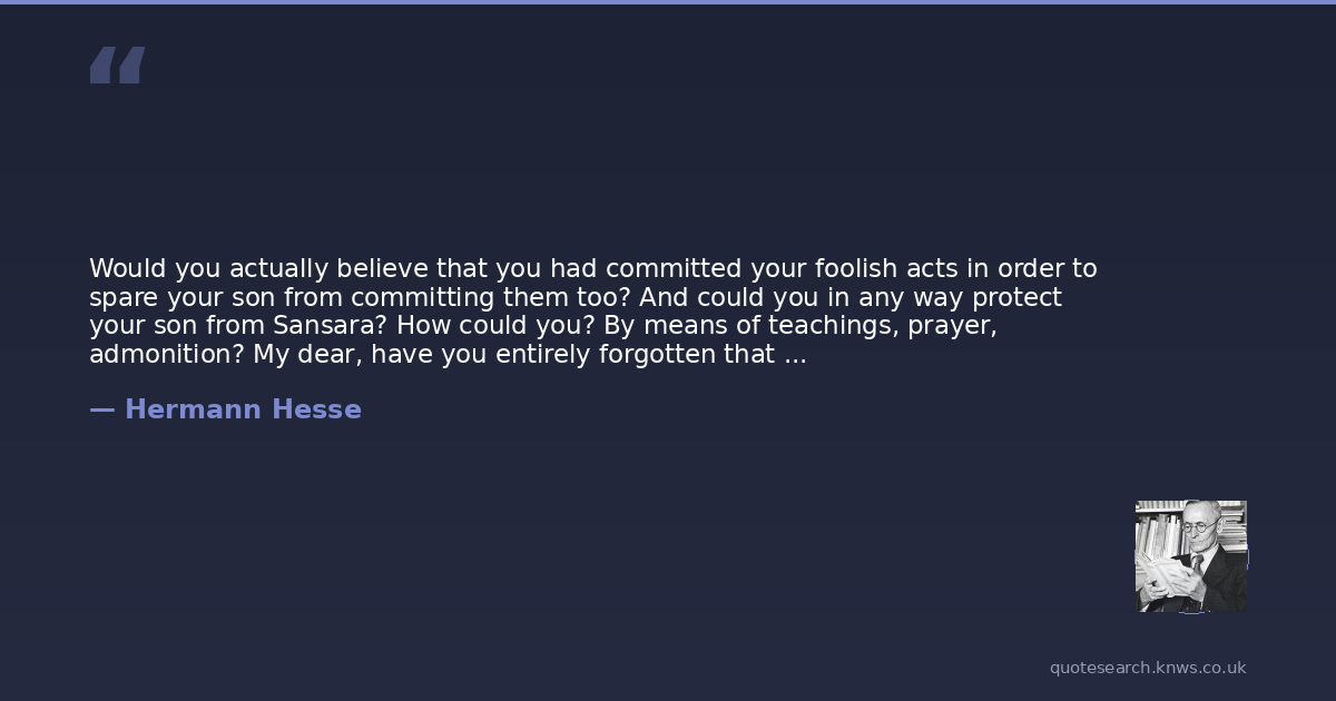 Would you actually believe that you had committed your foolish acts in order to spare your son from committing them too? And could you in any way protect your son from Sansara? How could you? By means of teachings, prayer, admonition? My dear, have you entirely forgotten that story, that story containing so many lessons, that story about Siddhartha, a Brahman's son, which you once told me here on this very spot? Who has kept the Samana Siddhartha safe from Sansara, from sin, from greed, from foolishness? Were his father's religious devotion, his teachers warnings, his own knowledge, his own search able to keep him safe? Which father, which teacher had been able to protect him from living his life for himself, from soiling himself with life, from burdening himself with guilt, from drinking the bitter drink for himself, from finding his path for himself? Would you think, my dear, anybody might perhaps be spared from taking this path? That perhaps your little son would be spared, because you love him, because you would like to keep him from suffering and pain and disappointment? But even if you would die ten times for him, you would not be able to take the slightest part of his destiny upon yourself.