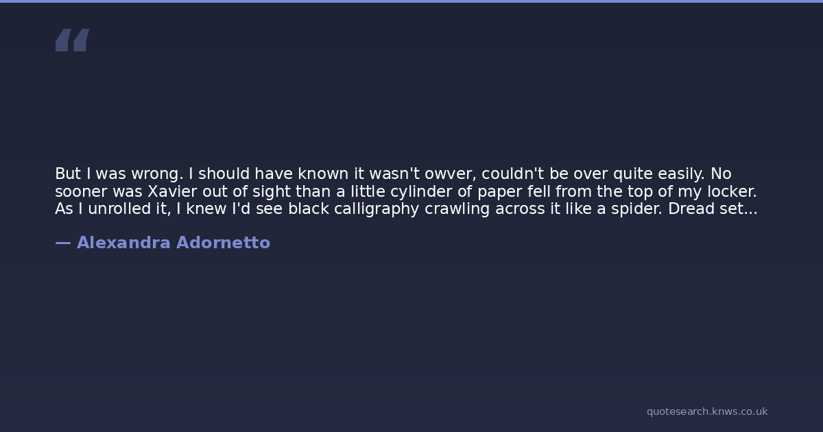 But I was wrong. I should have known it wasn't owver, couldn't be over quite easily. No sooner was Xavier out of sight than a little cylinder of paper fell from the top of my locker. As I unrolled it, I knew I'd see black calligraphy crawling across it like a spider. Dread settled around me like a fog as the words burned into my brain: The Lake of Fire awaits my lady