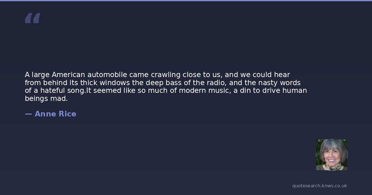 A large American automobile came crawling close to us, and we could hear from behind its thick windows the deep bass of the radio, and the nasty words of a hateful song.It seemed like so much of modern music, a din to drive human beings mad.