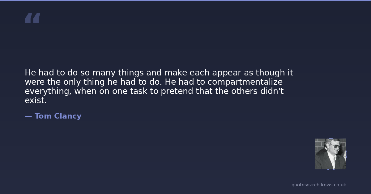He had to do so many things and make each appear as though it were the only thing he had to do. He had to compartmentalize everything, when on one task to pretend that the others didn't exist.