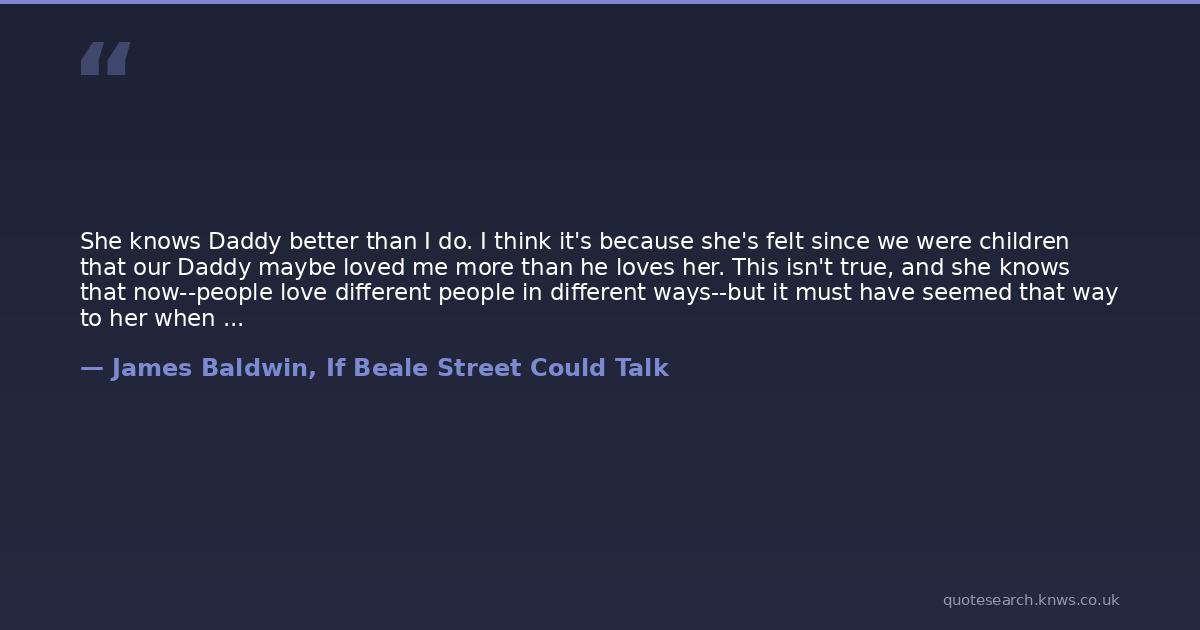 She knows Daddy better than I do. I think it's because she's felt since we were children that our Daddy maybe loved me more than he loves her. This isn't true, and she knows that now--people love different people in different ways--but it must have seemed that way to her when we were little. I look as though I just can't make it, she looks like can't nothing stop her. If you look helpless, people react to you in one way and if you look strong, or just come on strong, people react to you in another way, and, since you don't see what they see, this can be very painful. I think that's why Sis was always in front of that damn mirror all the time, when we were kids. She was saying, 'I don't care. I got me.' Of course, this only made her come on stronger than ever, which was the last effect she desired: but that's the way we are and that's how we can sometimes get so fucked up. Anyway, she's past all that. She knows who she is, or, at least, she knows who she damn well isn't.