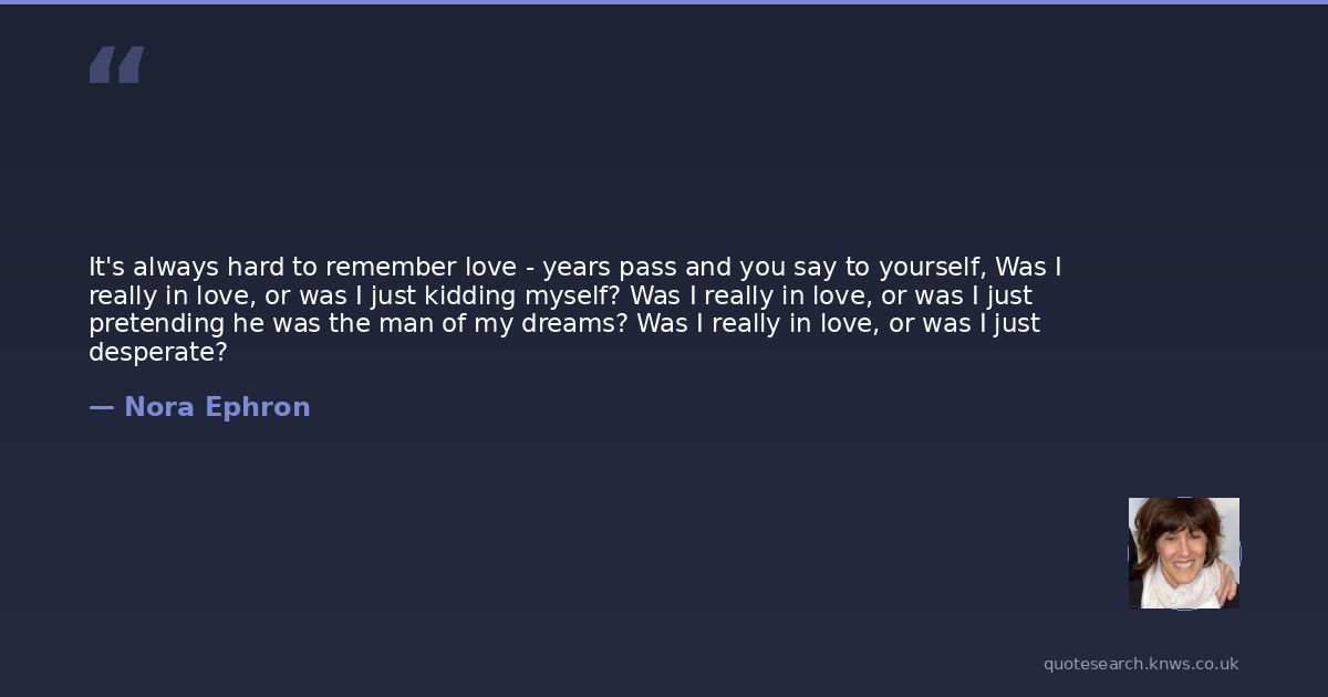 It's always hard to remember love - years pass and you say to yourself, Was I really in love, or was I just kidding myself? Was I really in love, or was I just pretending he was the man of my dreams? Was I really in love, or was I just desperate?