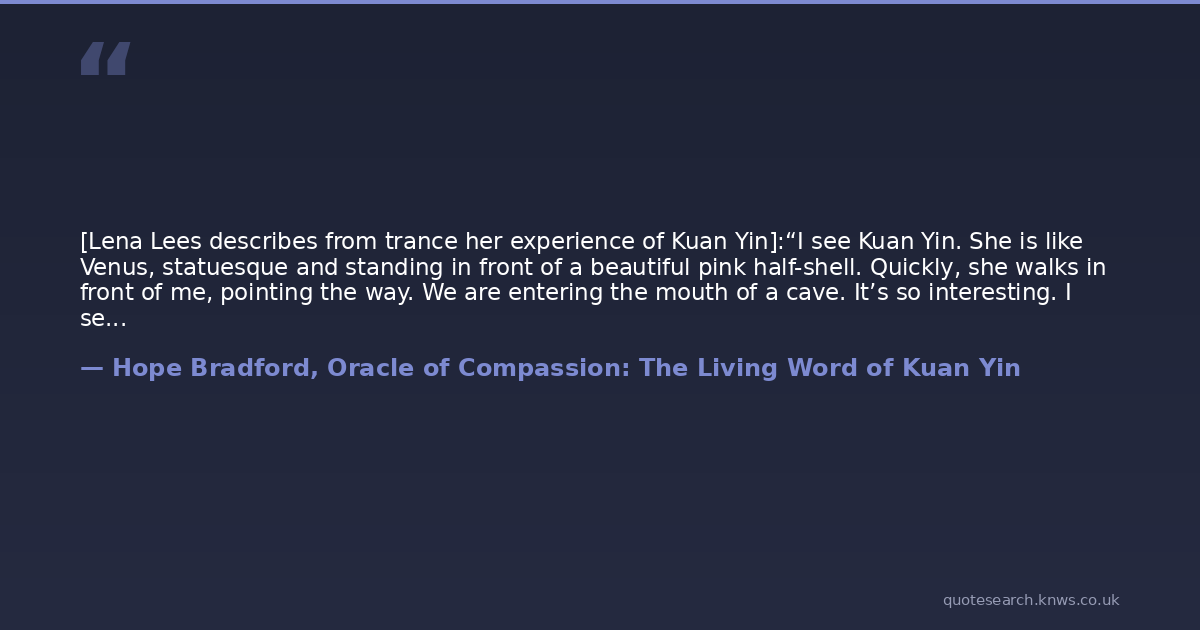 [Lena Lees describes from trance her experience of Kuan Yin]:“I see Kuan Yin. She is like Venus, statuesque and standing in front of a beautiful pink half-shell. Quickly, she walks in front of me, pointing the way. We are entering the mouth of a cave. It’s so interesting. I see stairs carved out of rock in the cave. We walk up the stairs to a door. I know somehow this is just another entrance, a doorway to another time, place. Perhaps at another historical time monks lived there. Now, I’m seeing a huge image, a beautiful statue of Kuan Yin right at the top of the mountain. There are stairs leading up to her and it is as if I’m right on location, standing alongside a group of worshipers. I feel the potency of her energy. In these places, perhaps China or Vietnam, there is a palpable sense of being immersed in and supported by her presence. There is a need by the people to know more, to pick up and accumulate wisdom. I’m suddenly feeling a need to be in that kind of energy. Suddenly it is Kuan Yin who is speaking: “Some believe I am in servitude to Buddha. However, Buddha doesn’t see it like that. We’re more like brother and sister. I’m showing, Lena, my abode, a place on earth where humans can visit me and be in my potency. Lena is looking at my statue and then at my form. There’s a difference. I come to people in many forms, forms constructed from people’s own perceptions of how I should come to them. And it is individual spiritual needs that create these unique perceptions. In the end, it does not matter what form I take.”“Kuan Yin wants me to know that I can have the most divine life imaginable,” whispers Lena, still very deep in trance. “She’ll be here until the last soul passes off the earth. She remains in deity form to assist people in transcending their materialistic nature, to help them attain their highest spiritual level.