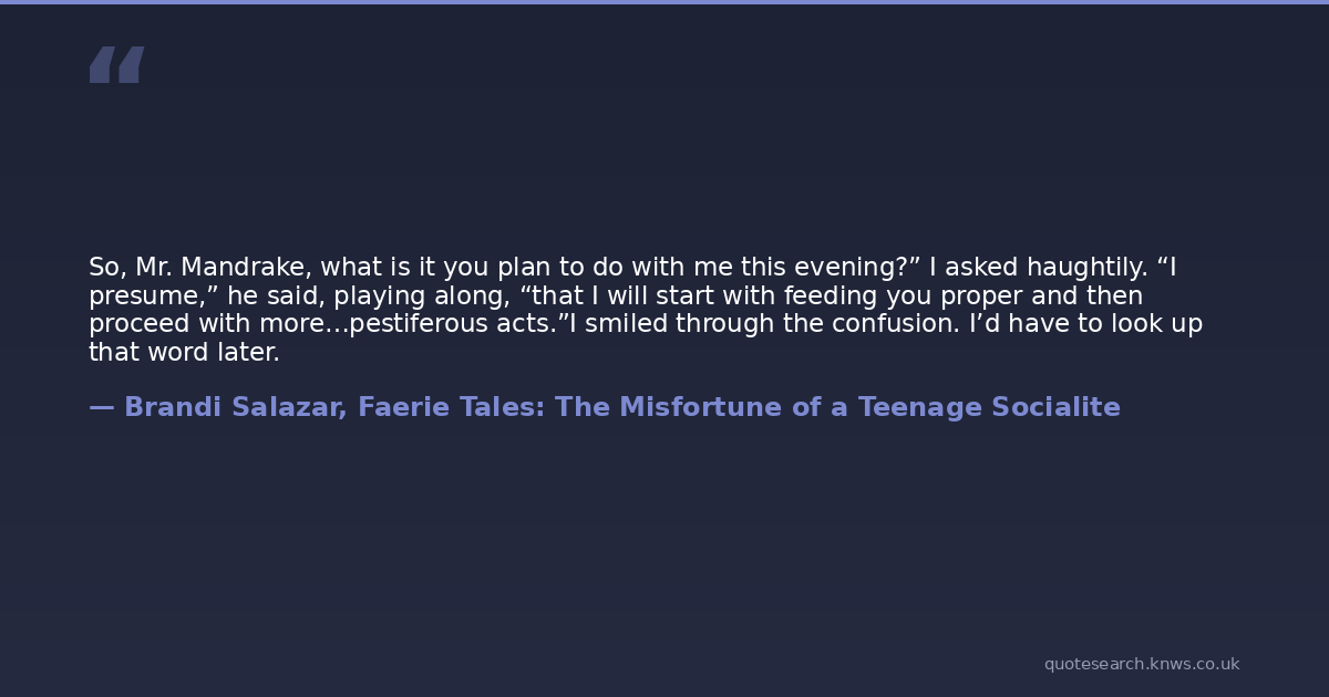 So, Mr. Mandrake, what is it you plan to do with me this evening?” I asked haughtily. “I presume,” he said, playing along, “that I will start with feeding you proper and then proceed with more…pestiferous acts.”I smiled through the confusion. I’d have to look up that word later.